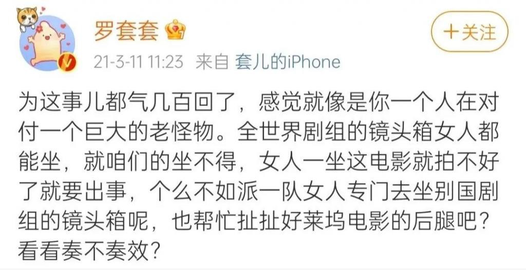 以及,经常爆出一些 " 封建剧组 " 的森严规矩,女性不能坐镜头箱等等。