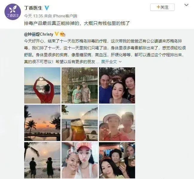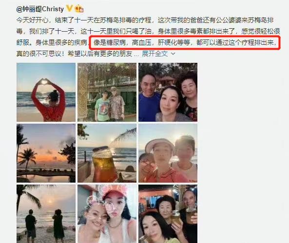 有一回,钟丽缇兴冲冲地在微博分享自己带家人去泰国苏梅岛喝椰子油排毒的经历。