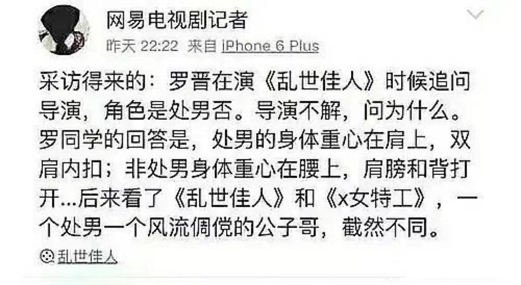 实际这条热搜起因于,前阵子有人突然翻出了早年罗晋和导演探讨处男和非处男的不同演法: