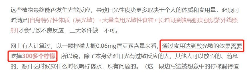 " 晒太阳前不能吃柠檬、橙子、胡萝卜 …… 因为这些光敏性食物会引起光过敏 "。