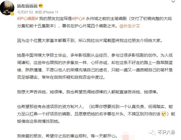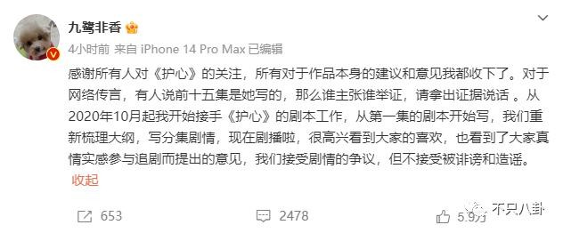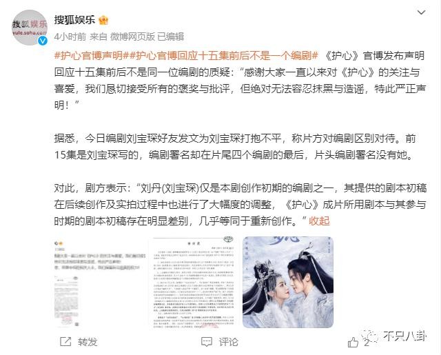 今天,一位网友发文称《护心》的前十五集和后面确实不是一个编剧写的,精华部分是自己的朋友刘宝琛执笔 ↓