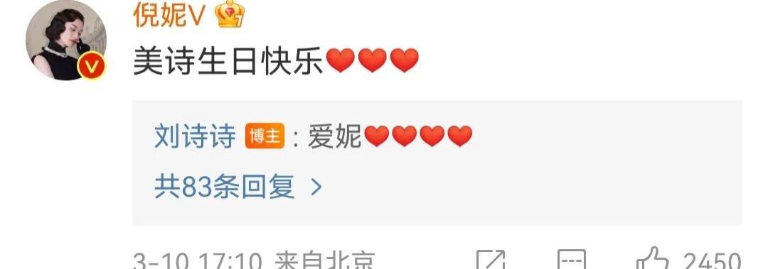 她虽然工作不积极,但人气还在的。她这次生日,杨幂给她送了祝福,倪妮也送去了祝福,人缘很好,也证明她当红花旦的地位依然还在。
