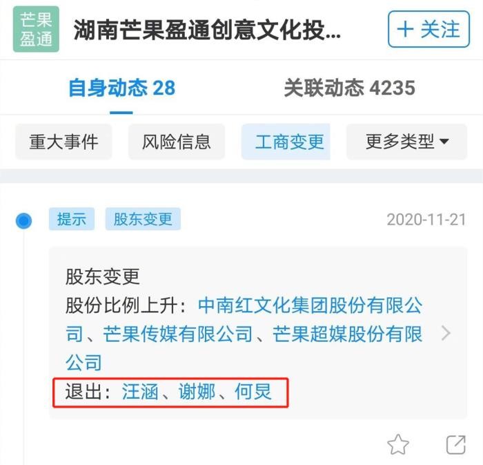而就在本月21日,该企业发生工商变更,原股东汪涵、何炅、谢娜退出,之后并没有新股东加入,剩余股东的股份比例皆上升,据悉汪涵、何炅和谢娜在退出股东前都各持股2.3992%。