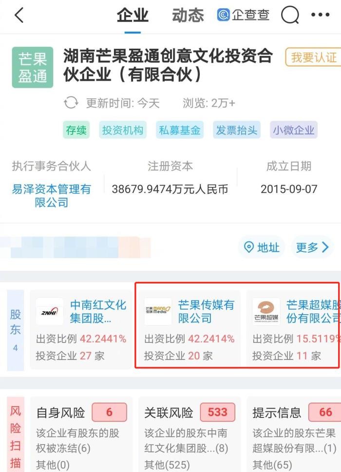 据相关网站上显示,芒果文创基金成立于2015年9月,注册资本约3.87亿元人民币,执行事务合伙人为易泽资本管理有限公司,经营范围包含以自有资产进行文化行业投资等。该公司目前由中南、芒果传媒有限公司、芒果超媒、易泽资本管理有限公司共同持股。