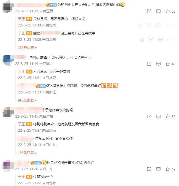 对于于正此次的回应,有网友留言告诉于正 P 图可以只 P 单人,于正回复:" 不会单 p,只会一键美颜 "。也有网友说于正和两个女艺人的合影,引得很多瓜溜她俩,于正回复道:" 瓜就是瓜,是不是真的,得我来说!" 该网友继续询问称 " 现在定人了吗?",于正表示 " 没定完呢,还在寻找中。" 还有网友打趣道:" 你是不是为了说明你原相机其实很好看才放这张的 ",于正回复称 " 人艰不拆 "。