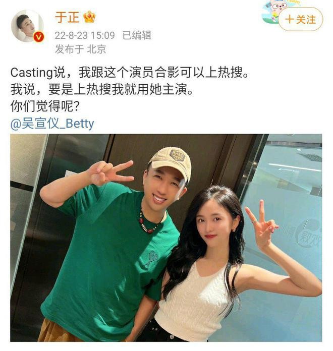 网易娱乐 8 月 23 日报道 23 日,于正在社交平台晒出与吴宣仪的合照,并配文道:""Casting 说,我跟这个演员合影可以上热搜。我说,要是上热搜我就用她主演。" 镜头中两人都对着镜头微笑比耶,但照片中所使用的美颜滤镜却引起了网友热议,不少网友表示 " 热搜是上了,但是美颜就不用开了吧。"