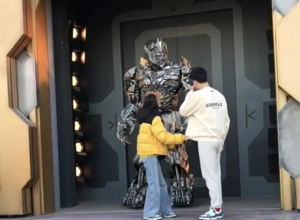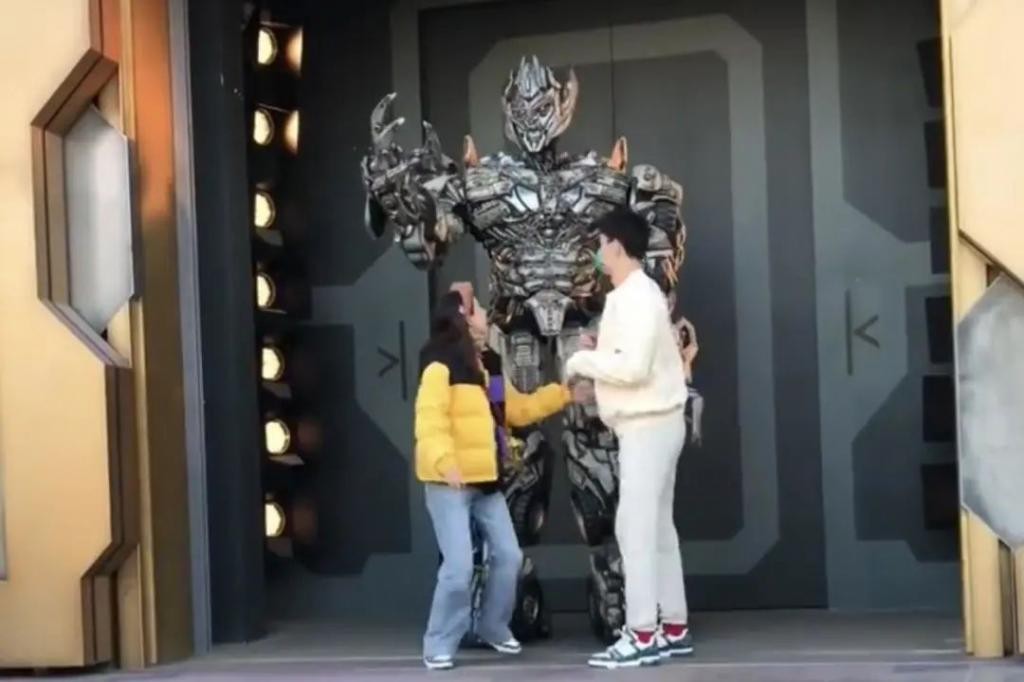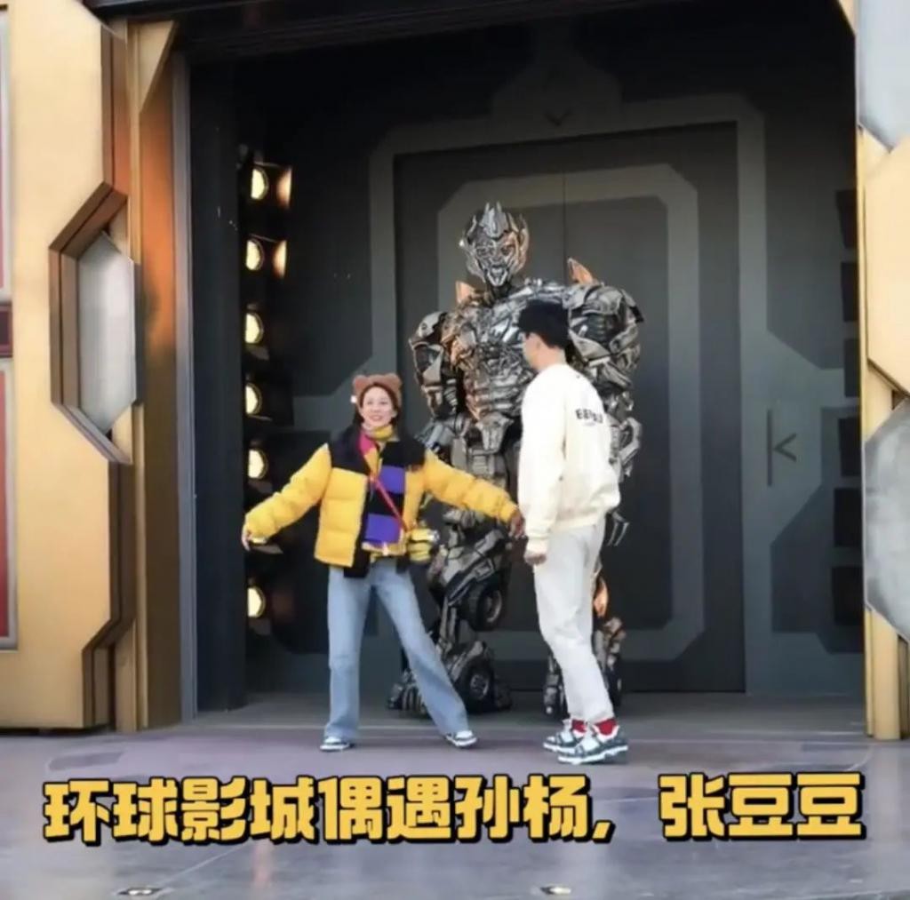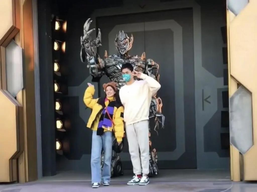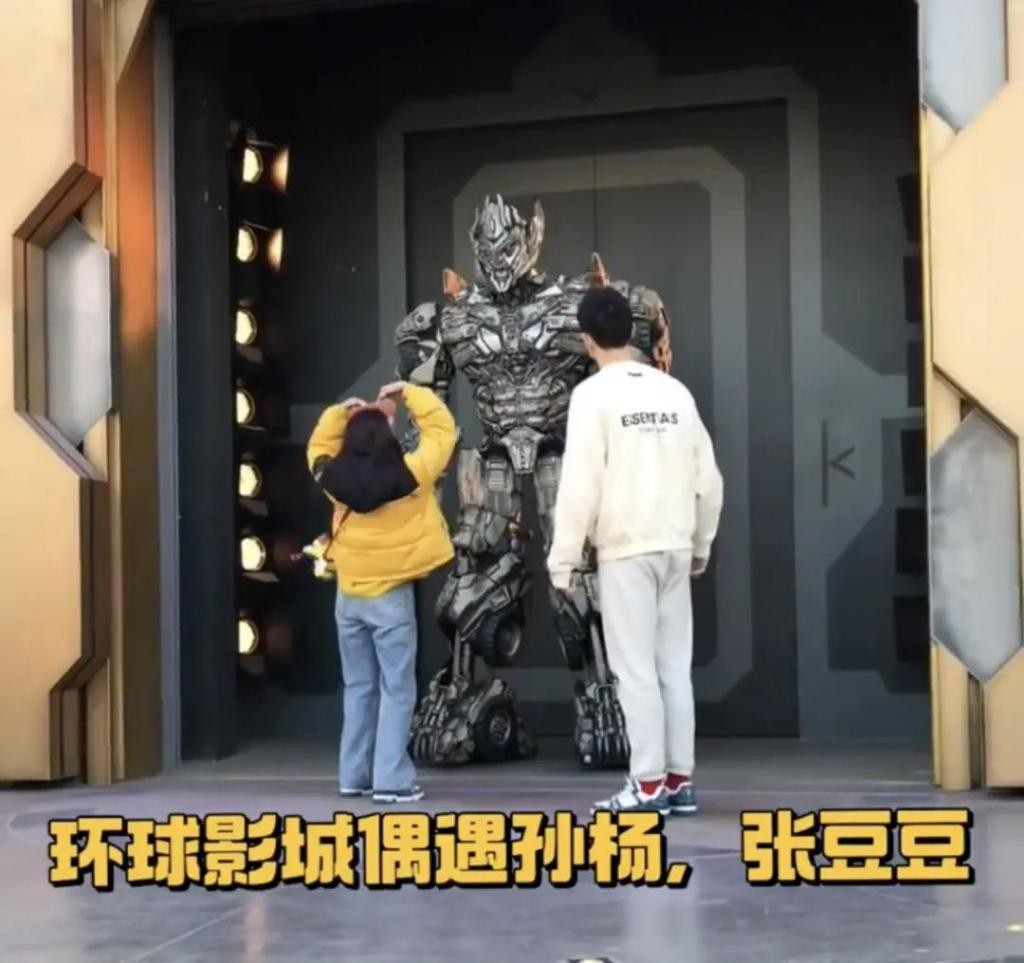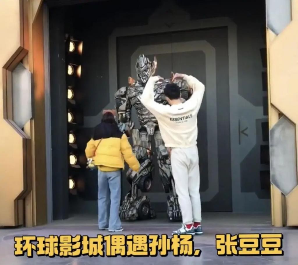 张豆豆站在 " 威震天 " 前面用手比心,孙杨也和女友做一样的动作,与平日里内敛的形象相比,反差感十足。
