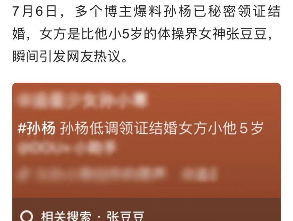 2025 年 7 月,孙杨被曝与张豆豆低调领证,女方肤白貌美,颜值丝毫不输给女星,还有体操界女神之称,两人可以说是金童玉女。当时他们长期在山西太原市的各大商场里牵手逛街,有人爆料称孙杨已在该地买房。