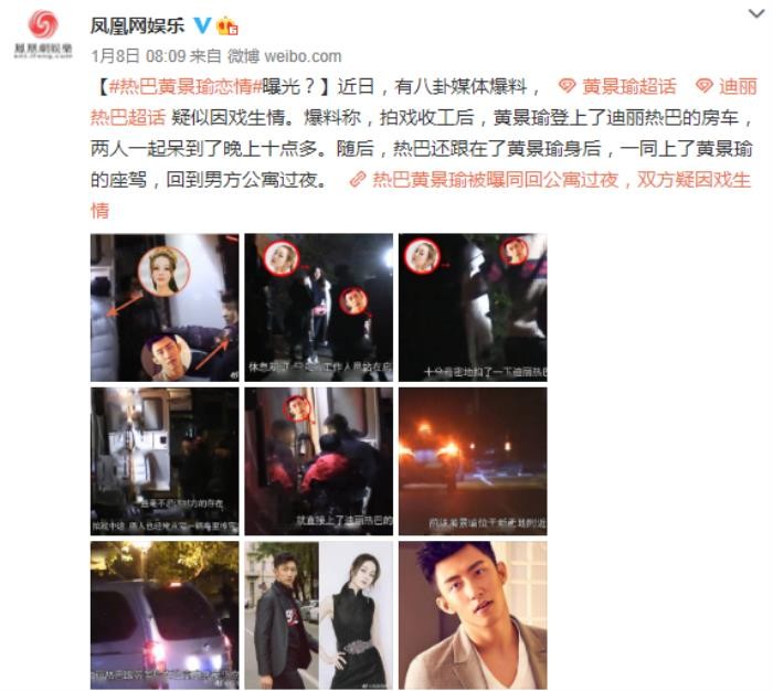 其实两人在合作电视剧《幸福触手可及》时就已经传出绯闻了。有媒体拍到黄景瑜收工后上了迪丽热巴的房车,两人在里面待了很久,之后迪丽热巴还跟着黄景瑜回到男方公寓过夜。