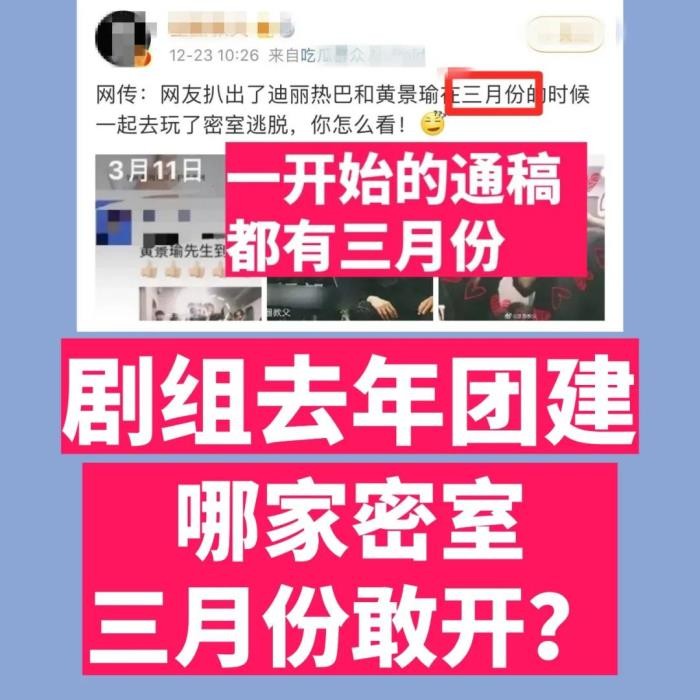 还有网络爆料称两人3月份的时候一起去了密室逃脱,因为不少偶像“塌房”故事中都存在密室逃脱这个重要场合,所以网友们也格外敏感。不过热巴粉丝很快也澄清,所谓的密室逃脱其实发生在去年3月份,是剧组多名演员和工作人员一起去的团建。