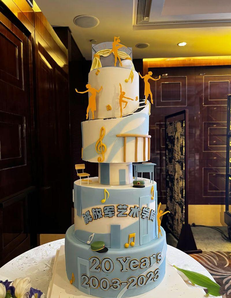蛋糕上放了解放军艺术学院的名字,除了有围着蛋糕起舞的舞者,还有音符、教室内的桌椅,以及代表解放军艺术学校的军帽。