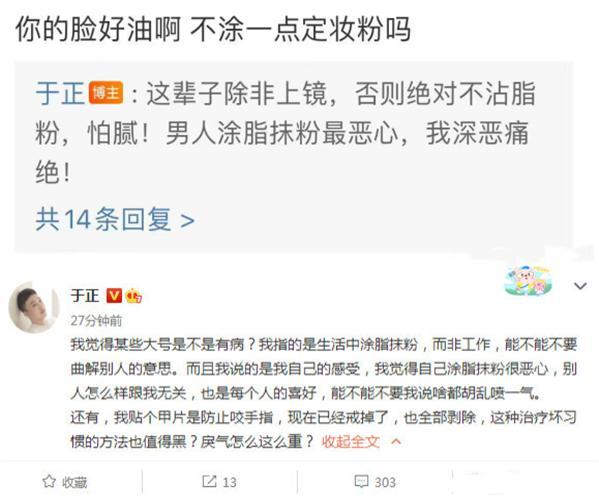 于正还曾吐槽过男人涂抹粉的事情:“这辈子除非上镜,否则绝对不沾脂粉,怕腻,男人涂脂抹粉最恶心,我深恶痛绝。”这件事也引发过热议,此后于正又得发个博文解释,真是辛苦。