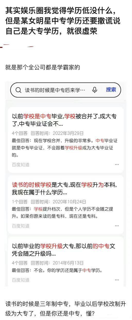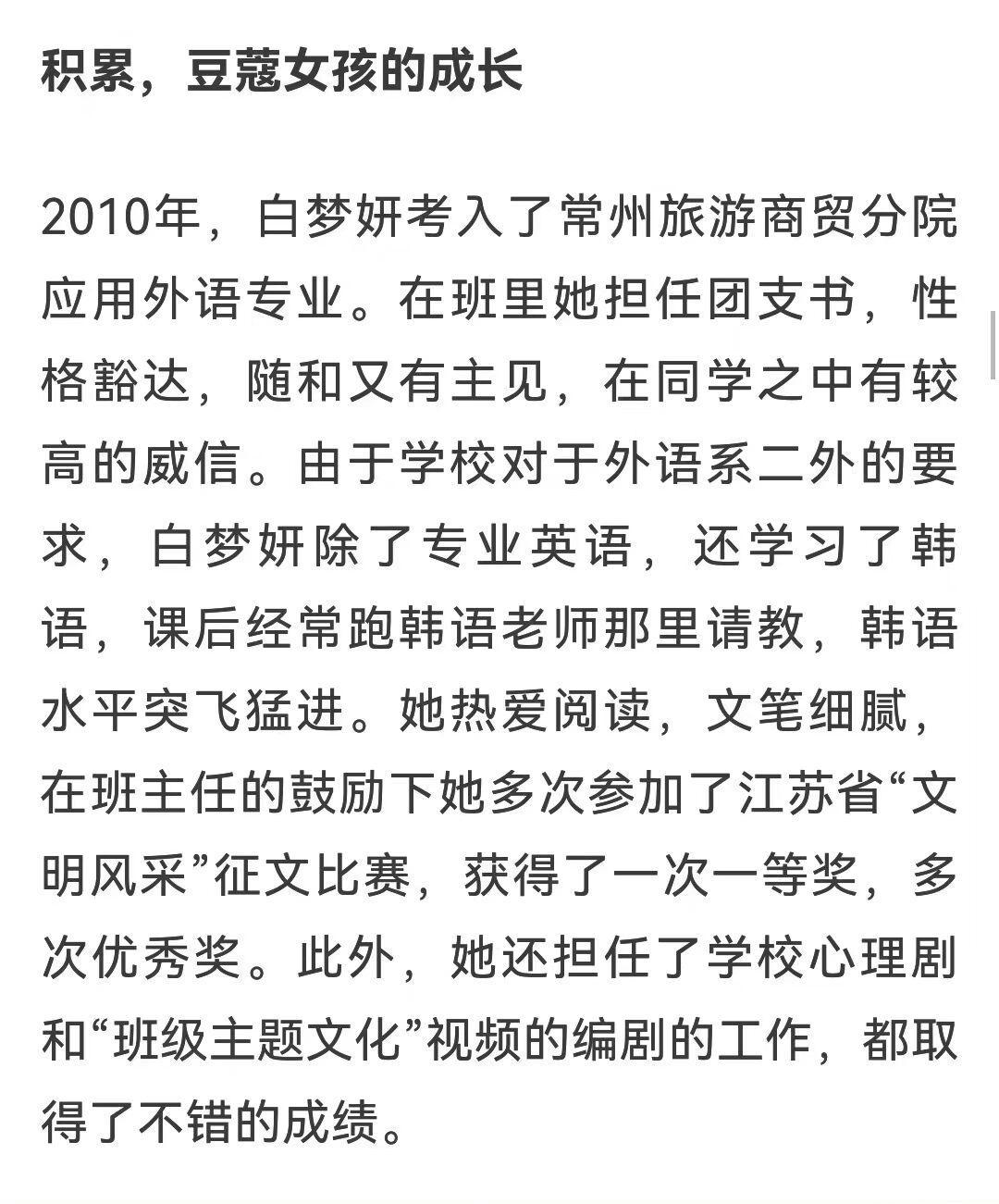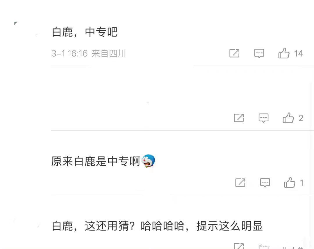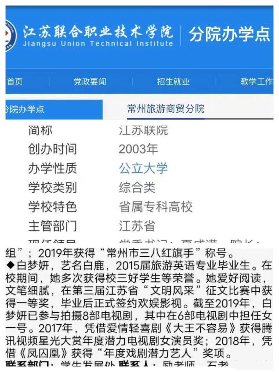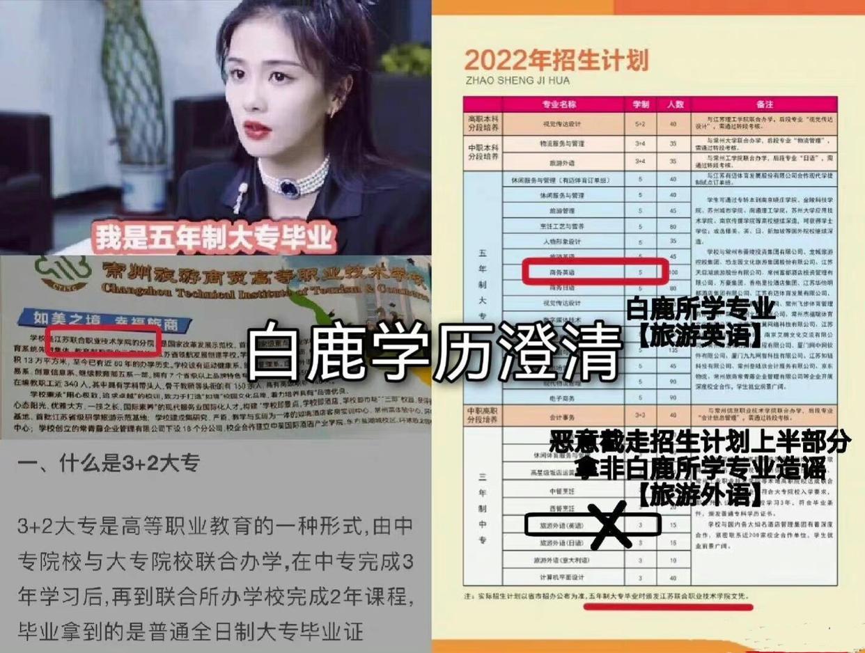 有网友发言:“其实娱乐圈我觉得学历低没什么,但是某女明星中专学历还要撒谎说自己是大专学历,就很虚荣。”此后很多人猜测该女明星指的是白鹿,因为白鹿毕业的学校是常州旅游商贸学院,据说该学校最初是中专,后来升到了大专,2010年白梦研(白鹿本名)考入了该校的应用外语专业,在班里担任团支书,性格很开朗,在学校也比较出名,课外她经常去韩语老师那里请教韩语,此外她还热爱写作,多次参加文学比赛,获得过一等奖和多次优秀奖。