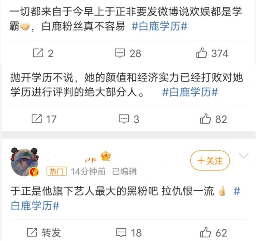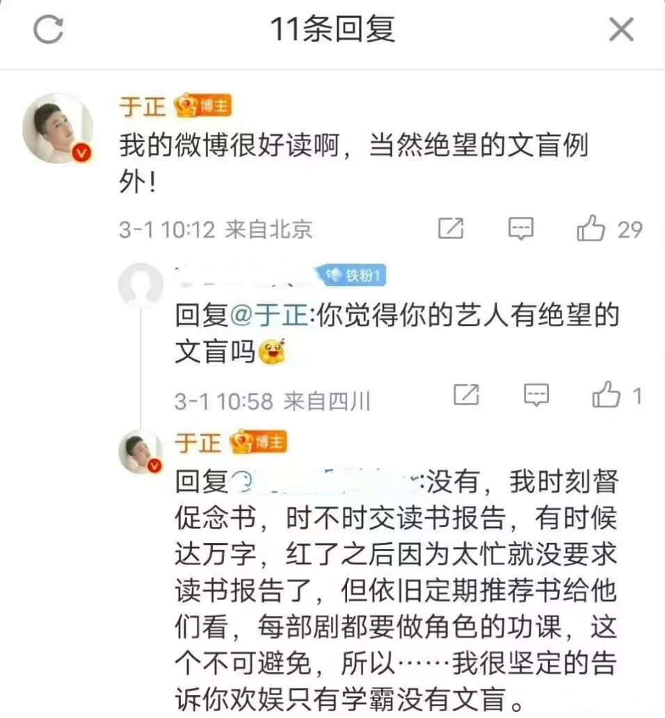 网友:“你觉得你的艺人有‘绝望的文盲’吗?”于正:“没有,我时刻督促念书,时不时交读书报告,有时候达万字,红了之后因为太忙就没要求读书报告了,但依旧定期推荐书给他们看,每部剧都要做角色的功课,这个不可避免,所以我很坚定的告诉你欢娱只有学霸,没有文盲。”然后无数人就白鹿是中专还是大专学历展开了争论。