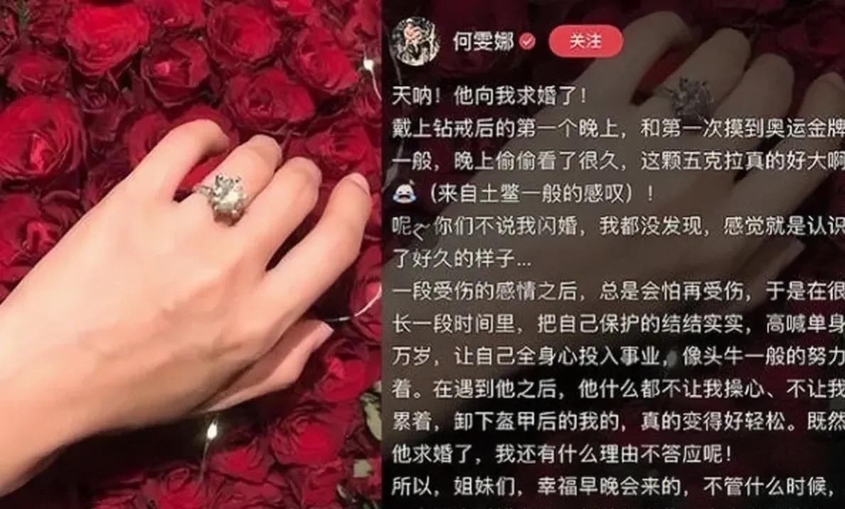 2019年,何雯娜在微博上高调晒出大钻戒,幸福之情溢出了屏幕。