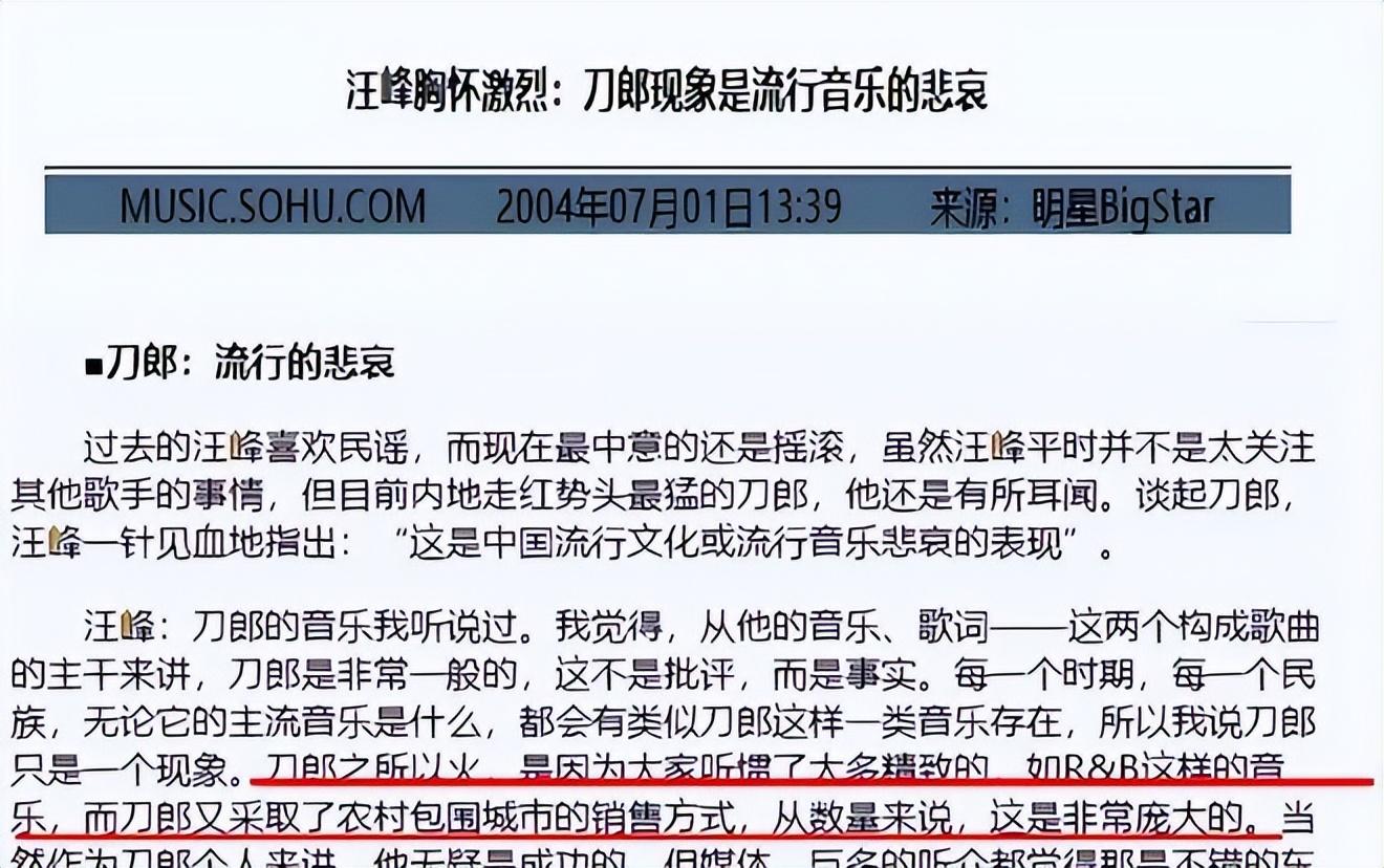 而汪峰也是在风头正盛的时候被爆料出来吐槽刀郎,说刀郎现象是流行音乐的悲哀,之所以能火,是因为大家听多了精致的歌曲,反而对刀郎这样农村的音乐新鲜。