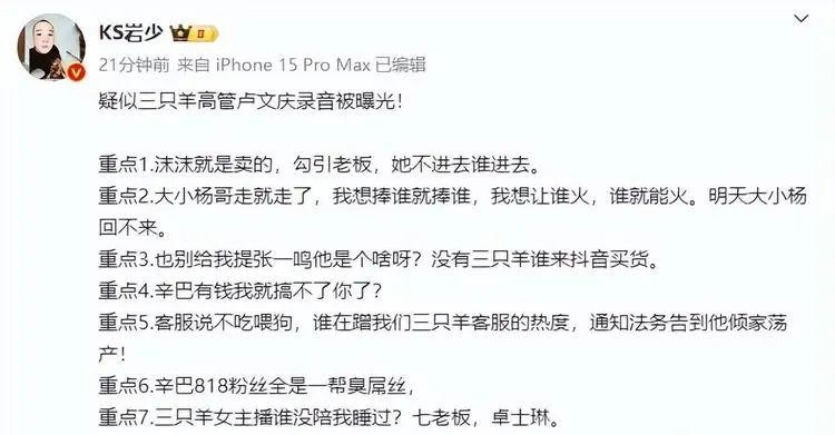 不过这一录音的真实性有待考证,毕竟当下的 AI 技术非常成熟。从曝光的录音中不难听出,涉及到的主要人物一共有六个,分别是三只羊沫沫、大小杨哥、七老板、卓仕琳、张一鸣、辛巴以及辛巴粉丝。总结来说,分为八个方向的爆料,其中张一鸣与辛巴以及辛巴粉丝占了三个。