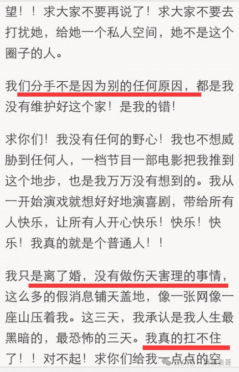 开篇就说他错了,说两人协议离婚已经快半年了,是和平分手,没有任何其他事情。