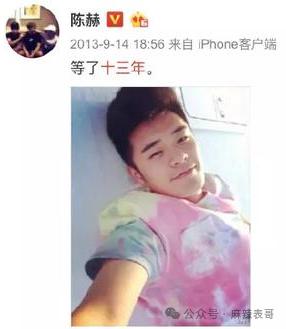 2013年9月,陈赫在微博发自拍,说"等了十三年"。