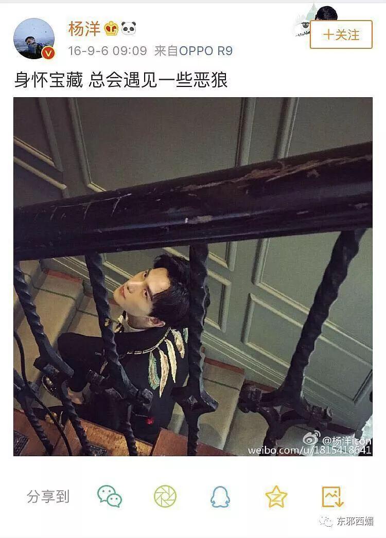 杨洋在上午9点09分发微博:"身怀宝藏,总会遇见一些恶狼"。流量还是深谙粉圈之道啊,特地选了9点09呼应自己9月9日的生日,粉丝果然被虐得不行,要为哥哥上刀山下火海铲清恶狼,嗷呜~~