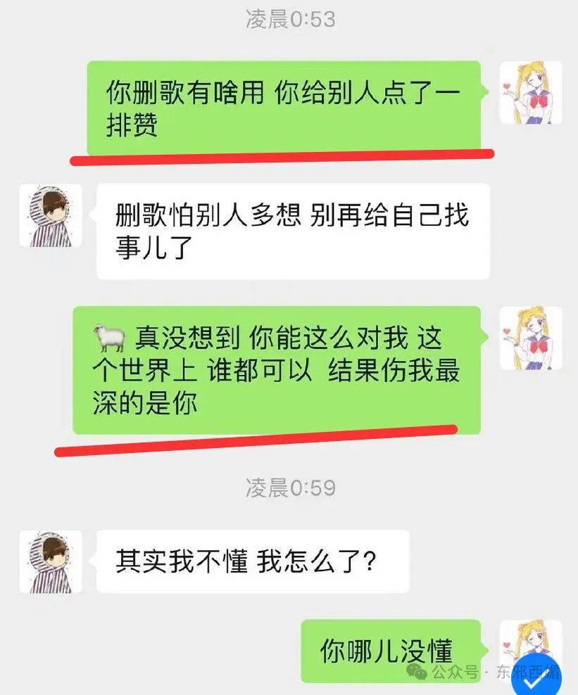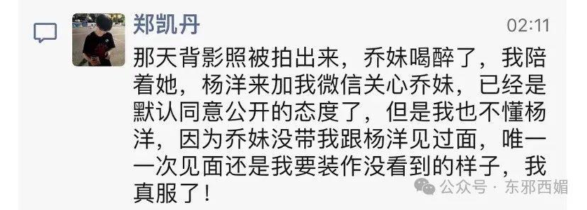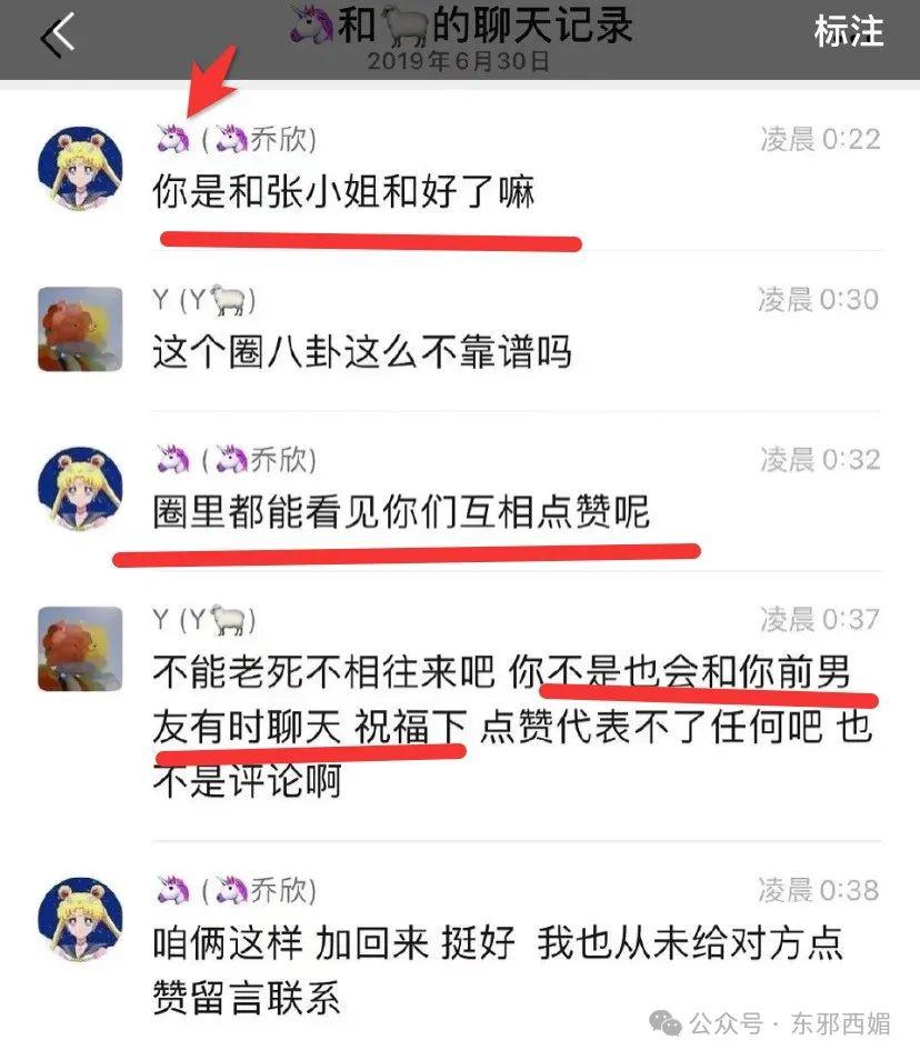 从聊天来看,疑似乔欣和杨洋分手后,看到他和"张小姐"互相点赞以为他们复合,杨否认后,乔对他说:伤我最深的是你。