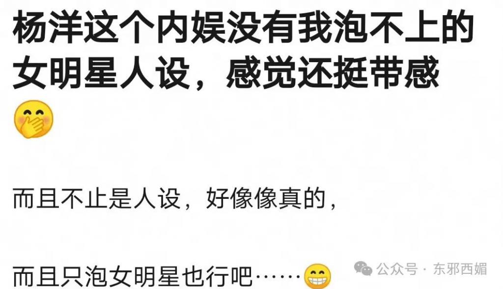 粉丝甚至嬉笑夸赞,这个瓜只证明了杨洋是娱乐圈唯一的直男,内娱没有他泡不上的女明星。