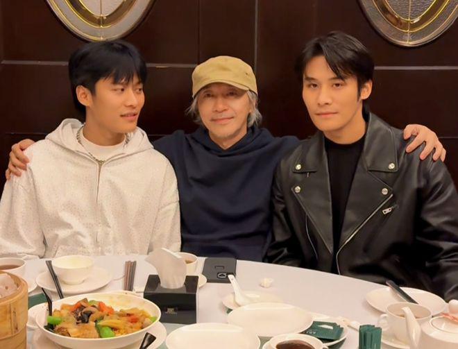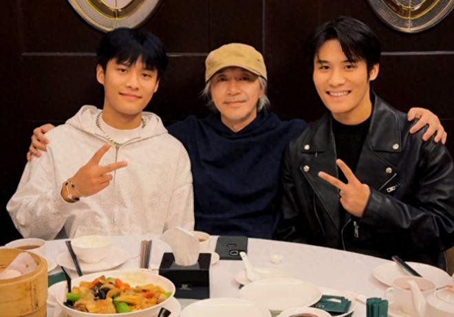 61 岁的星爷穿着黑色卫衣,头顶的鸭舌帽已经压不住满头白发,他搂着两个晚辈,面容祥和。