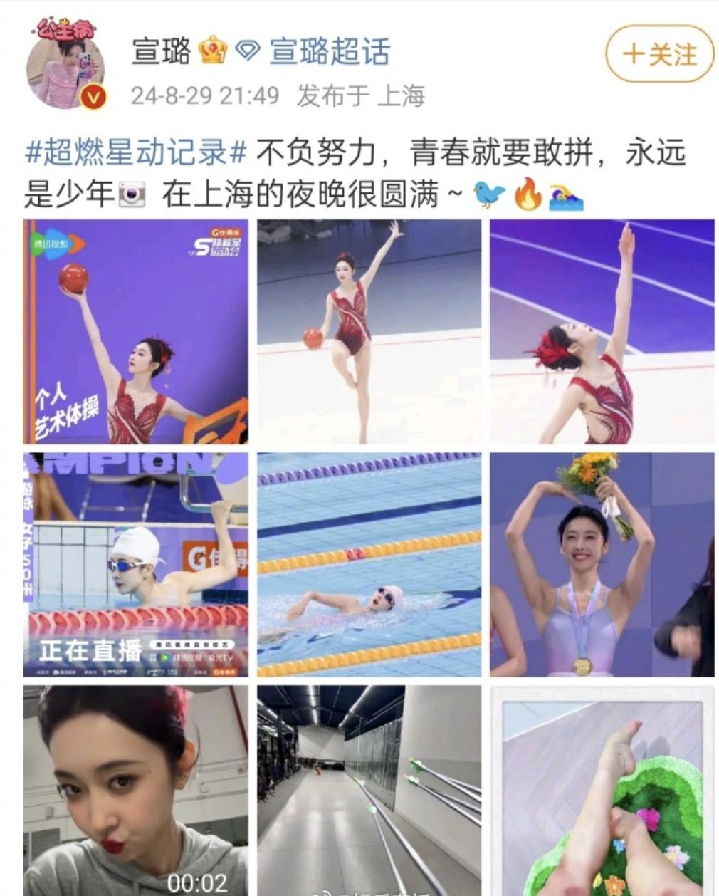 拿下游泳和自由体操双料冠军的宣璐,在拍戏之余,也花了非常多的时间去训练,才能保持这么好的体能和成绩。