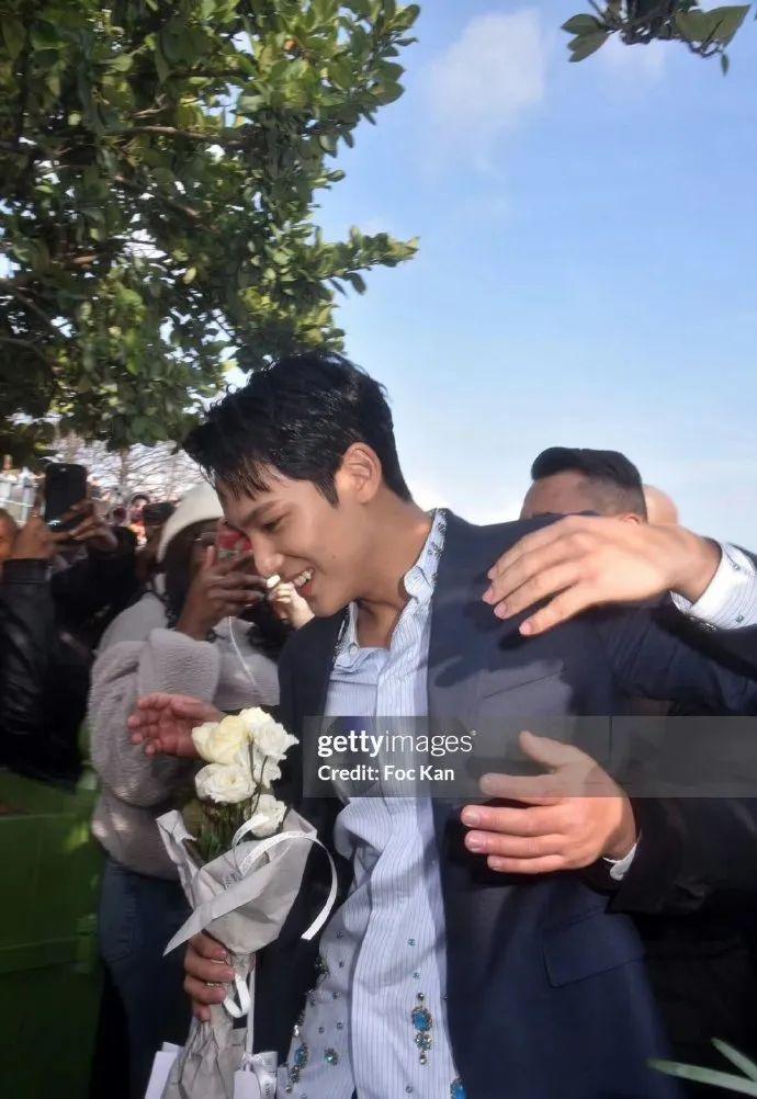 秀场外手拿白玫瑰,在G社的镜头下像是在接亲,铁塔、白玫瑰、飞吻、 热情的笑容、簇拥的人群......一切都是那么的恰当好处。