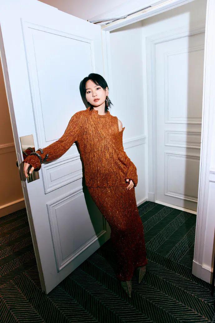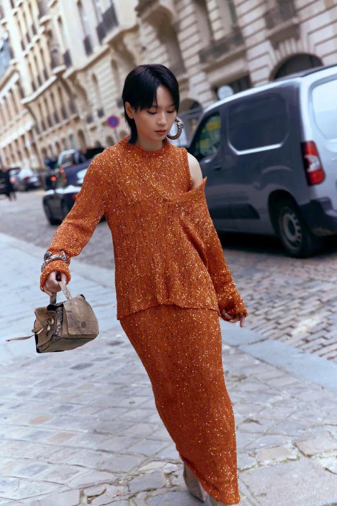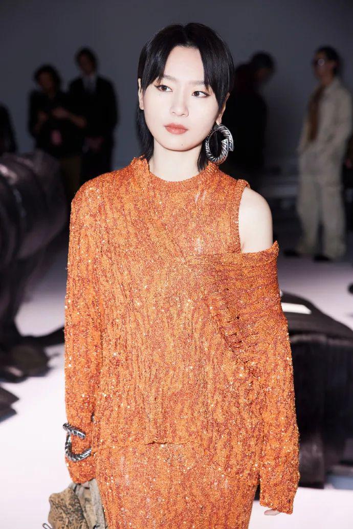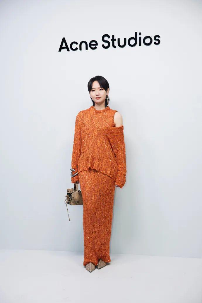 中国艺人Acne邀请了周笔畅,一袭橙色闪钻露肩套装搭配吸睛的金属耳环,明媚亮眼又个性。