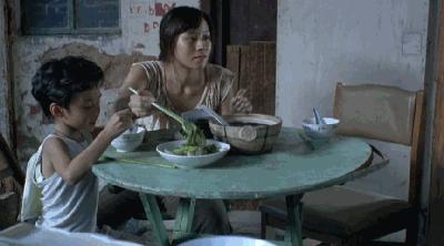电影这一段用慢镜头展示阿美惊慌呼叫地奔向子路,而子路嚎啕大哭地把手挥向跑来的母亲。在倾盆大雨的渲染之下,悲伤的气息扑面而来,让人心碎。
