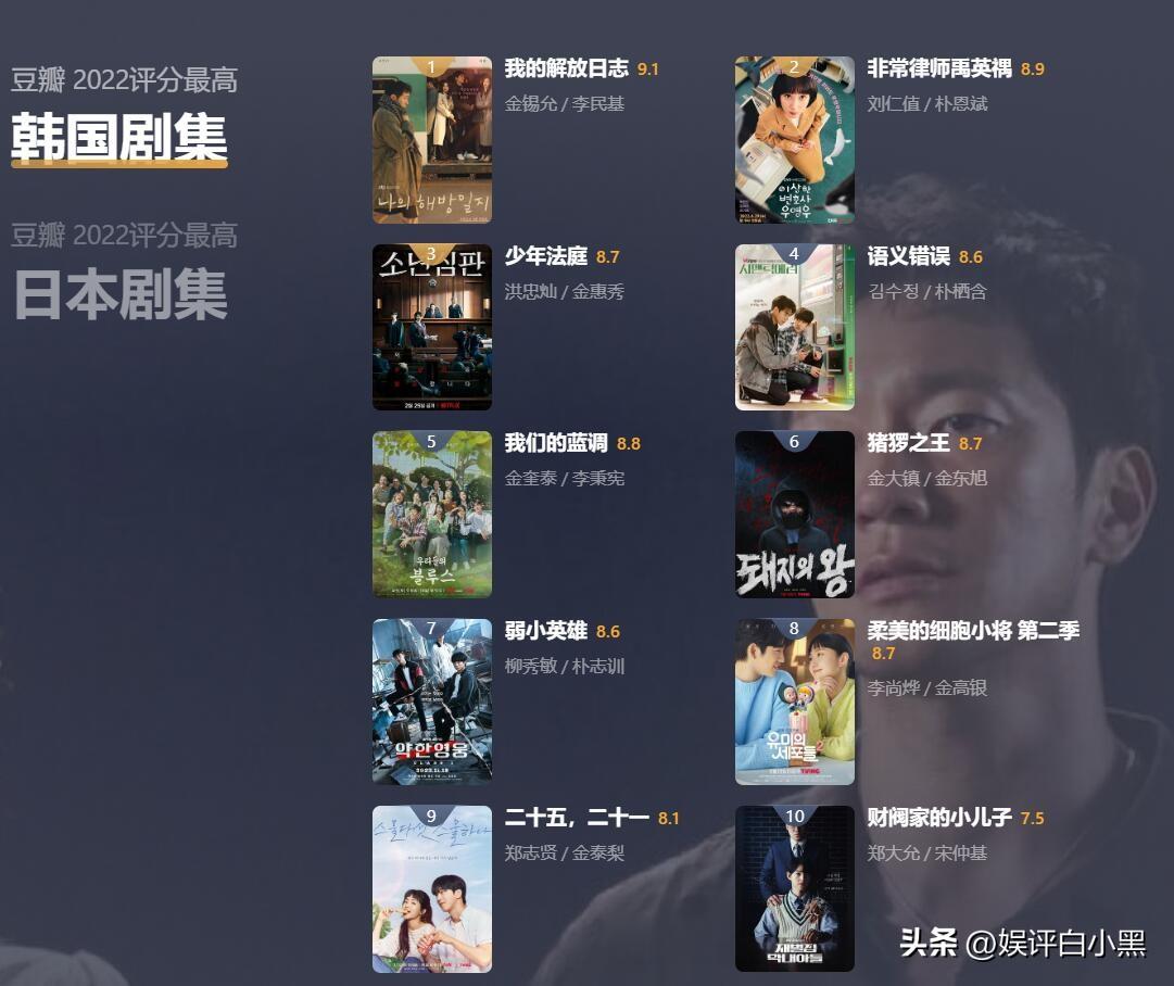 无论是抓取国内观众喜好数据的豆瓣,“2022年度榜单”之韩国剧集一栏;还是OTT综合搜索及推荐平台kinolights公布的2022年度韩剧;抑或韩国本土有关今年韩剧的各类评比排行榜。