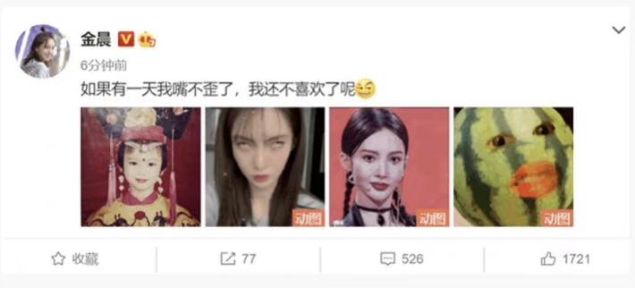 第二次被质疑嘴歪了的时候,金晨回应:“如果有一天我嘴不歪了,我还不喜欢了呢。”配图是一张小时候的照片,还有一张翻白眼的自拍照,白眼翻上天了。
