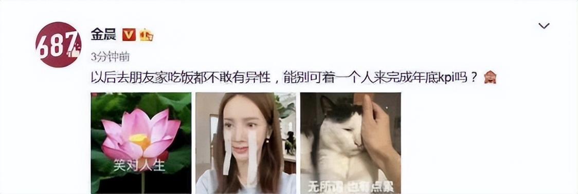 比如发文“以后去朋友家吃饭都不敢用异性,能别可着一个人来完成年底kpi吗?”配图是三张表示无辜的照片。金晨的文案无疑是在质疑狗仔为了完成年底任务,纯属没事找事。