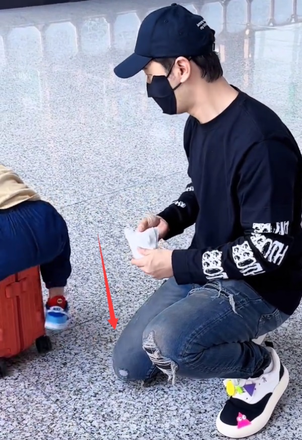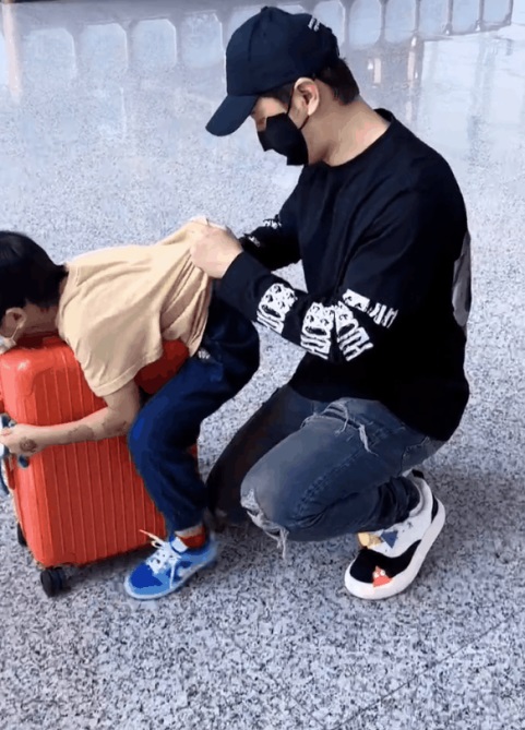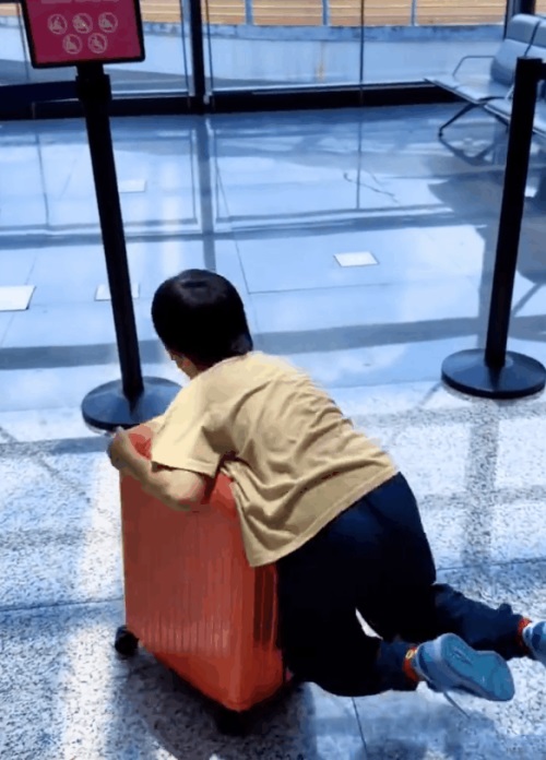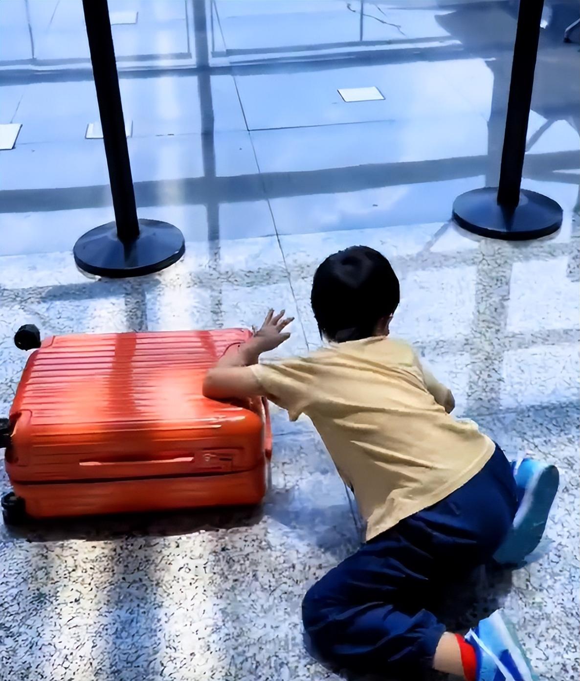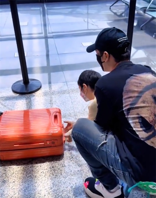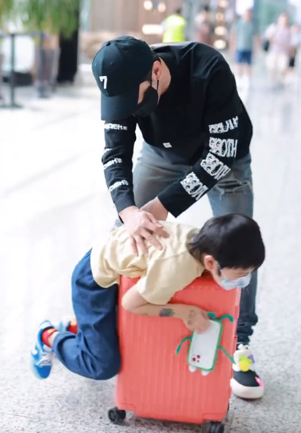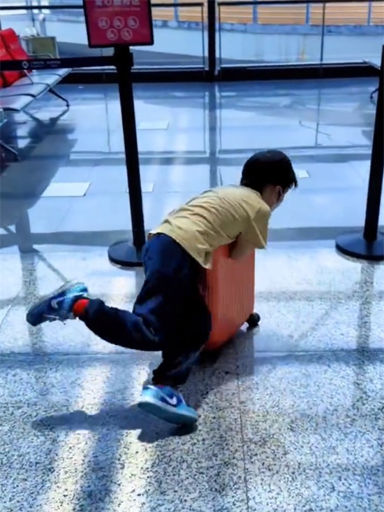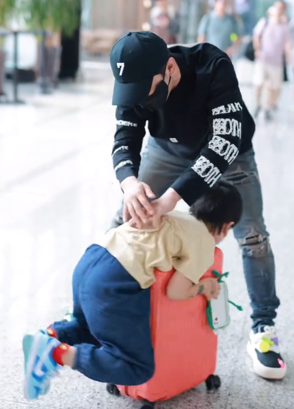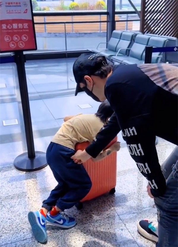 给儿子擦完汗后,黄晓明的眼神也一直盯着儿子,生怕机场人太多小海绵玩行李箱不安全,到了空旷的地方,黄晓明还配合儿子在行李箱上玩转圈圈,他站在身后保护着孩子,小海绵玩得很尽兴,开心的笑声飘荡在机场中。