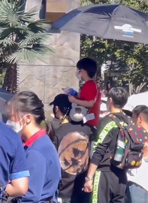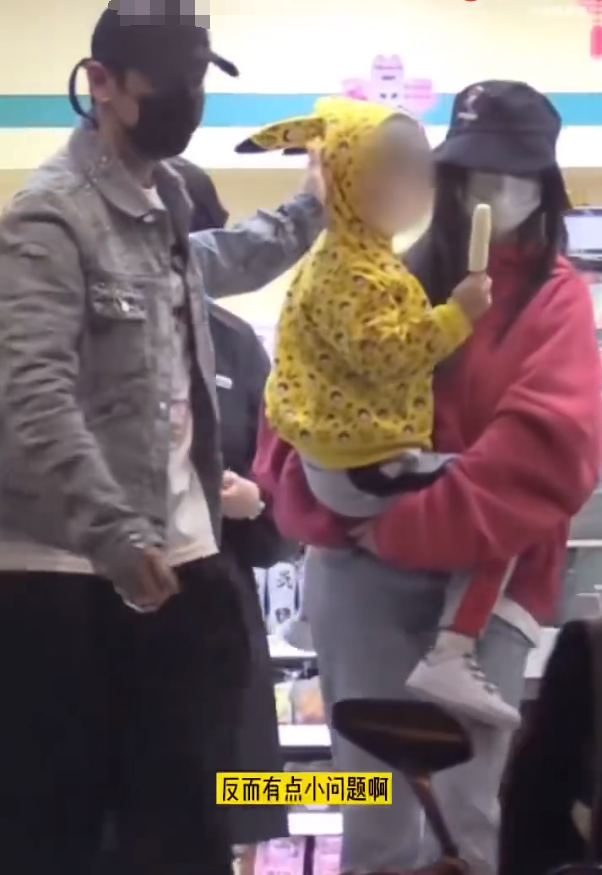 画面中,黄晓明身穿黑色长袖T恤搭配破洞牛仔裤,戴着黑色帽子和口罩,看上去就很热,小海绵则穿着清凉,蓝色休闲裤搭配米色短袖,脚穿舒适的运动鞋。黄晓明宠溺地摸着儿子的头,画面非常有爱。