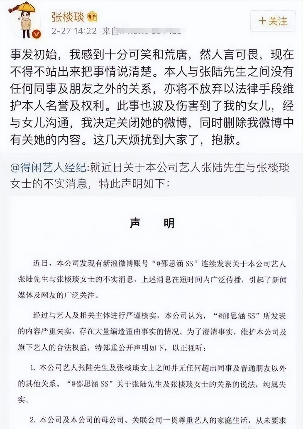 事后,张棪琰亲自发动态澄清,表示十分可笑与荒唐,多年来让其背负“小三”的罪名,称与张陆没有任何关系,同时要以大局手段维护自己的名誉及权利。