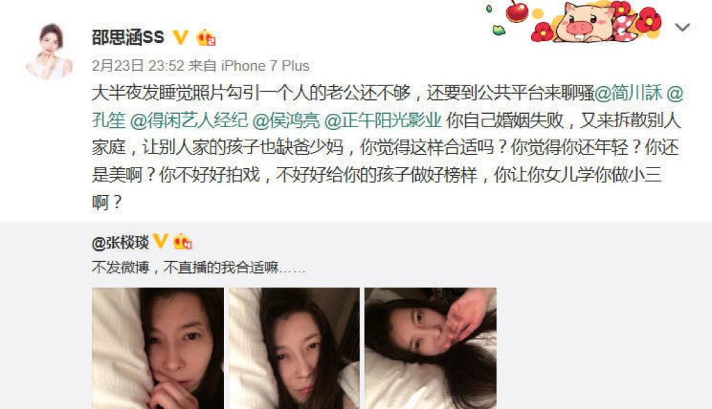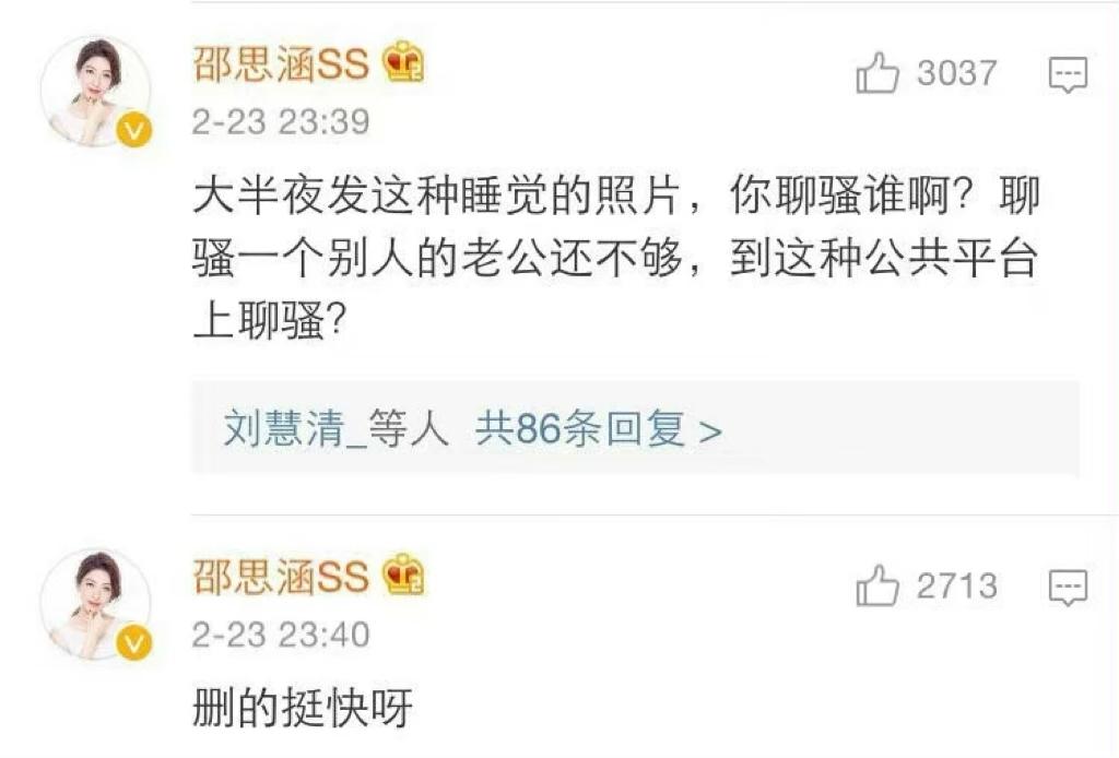 而且当时王柏川的老婆邵思涵还曾在社交平台中“手撕”过她,说半夜给她老公发暧昧短信等。