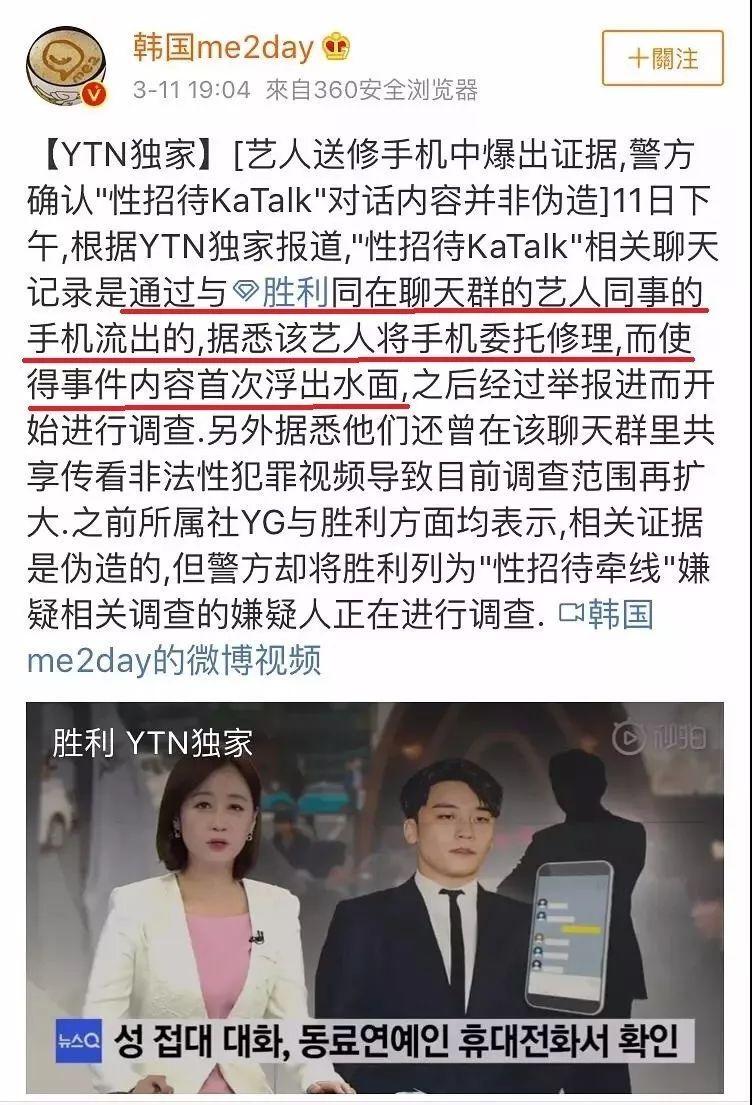 据说警方之所以找到这些聊天记录,完全是因为胜利的艺人同事将手机送去修理时而流出的,和陈冠希有异曲同工之妙,不过至少要感谢这位猪队友,让事实很快的浮出水面。