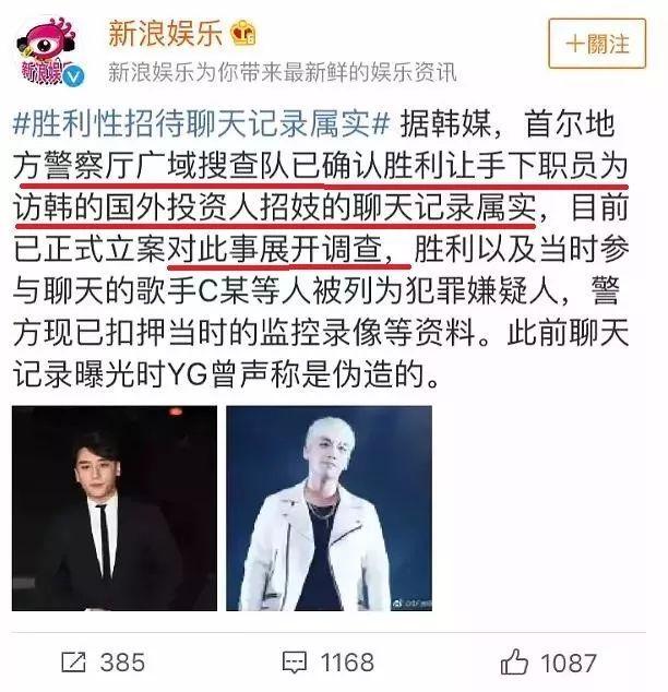 不料事情迎来转折,韩国相关单位很快公开证实网上的传言属实,警方就确认了胜利涉嫌为国外投资人招妓的的聊天记录属实,并且正式立案调查。