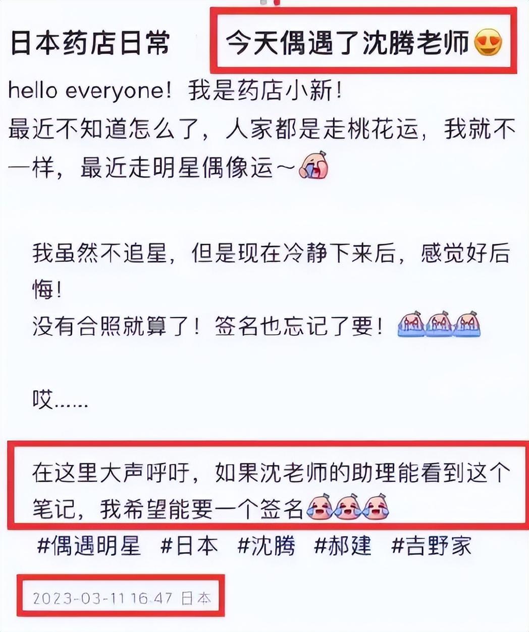 3月11日,有网友在日本某药店偶遇了沈腾,直呼后悔没有和沈腾要合影和签名。