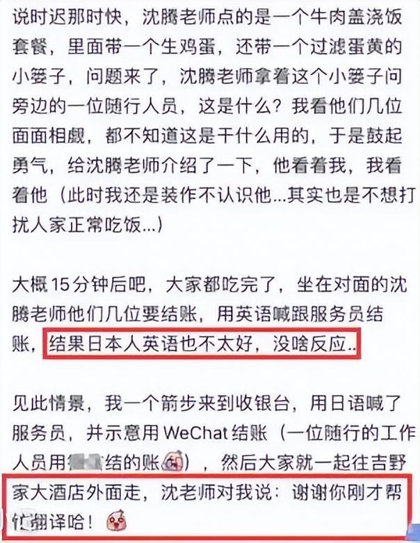 还有一位网友在小餐馆偶遇了沈腾,称沈腾点了一个牛肉盖浇饭,但是因为不通日语,结账时喊服务员也没人搭理,最后还是网友解围帮忙翻译,事后沈腾还特意感谢了这位网友。