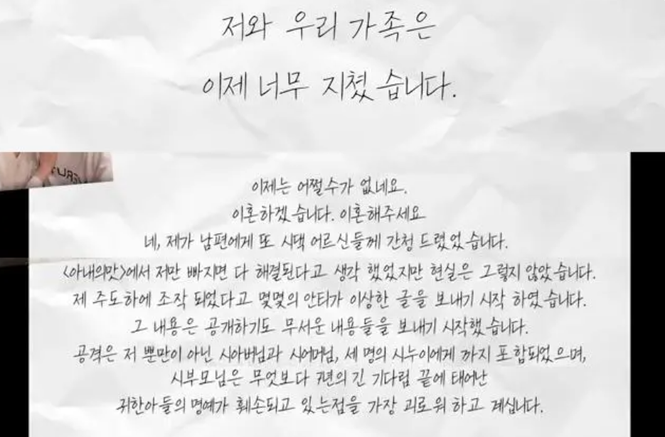 在信中咸素媛重复了几次要离婚,透露自己跟家人们生活很累,同时还要退出娱乐圈,今后可能要去其他国家生活。