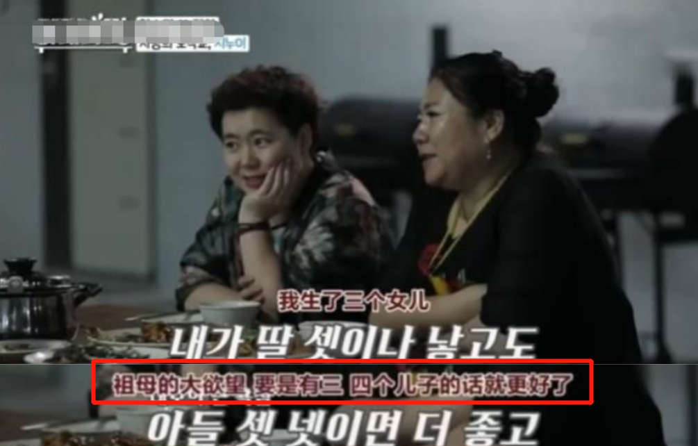 于是在节目中婆婆催生儿媳妇咸素媛,希望她能生下4个儿子给自己圆梦。同时咸素媛也在节目中透露,刚怀上女儿的时候,婆婆就表示希望肚子里的是个男孩。