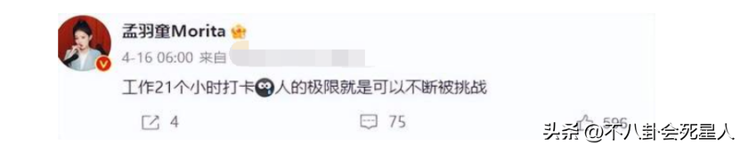 不过现在孟羽童因为工作太繁重,表示自己不能胜任。4月中旬,她曾发过一条动态,表示“工作21小时打卡”,还说“人的极限就是可以不断被挑战”,当时就有网友说孟羽童的工作量还是挺大的,这或许和她被当成接班人培养也有一定关系。
