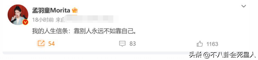 此外,值得关注的是孟羽童在被爆离职后,在自己的社交平台上更新了一条动态,表示“人生信条是靠别人不如靠自己。”令人感觉她的动态意有所指,接着她便很快删除了这条动态。