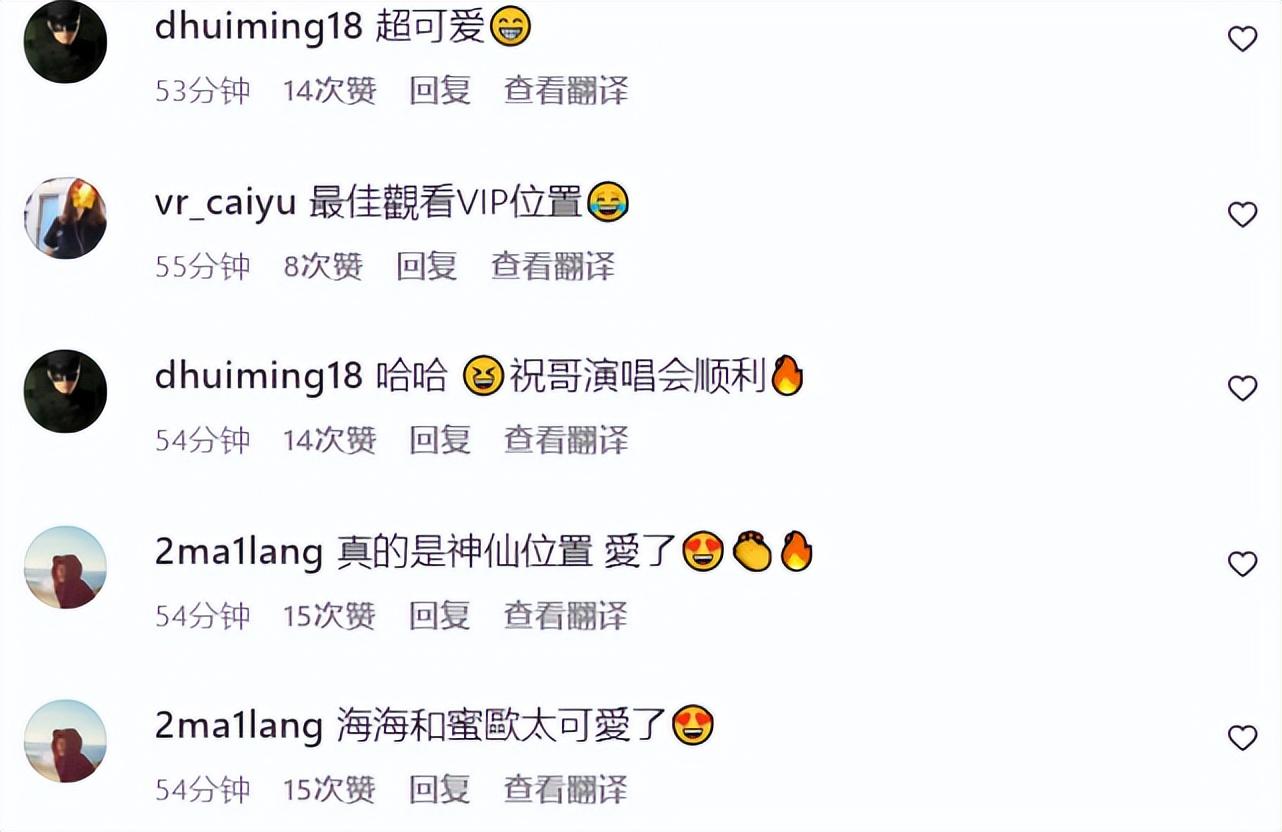 网友看后纷纷留言评论:“啊啊啊好羡慕”“真的是神仙位置,爱了”“最佳观看VIP位置”“超可爱”“祝哥演唱会顺利”“两个小朋友帮我们听听看”。