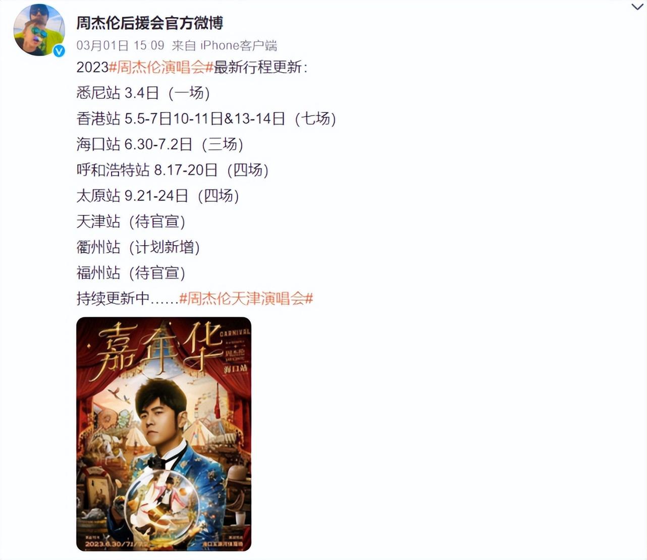 悉尼站之后,周杰伦嘉年华世界巡回演唱会便将陆续在国内城市开启,先是香港、海口,然后是呼和浩特和太原,此外,还有天津站和福州站待官宣。纵观周杰伦演唱会时间,基本贯穿了2023年一整年,周杰伦终于忙起来了。
