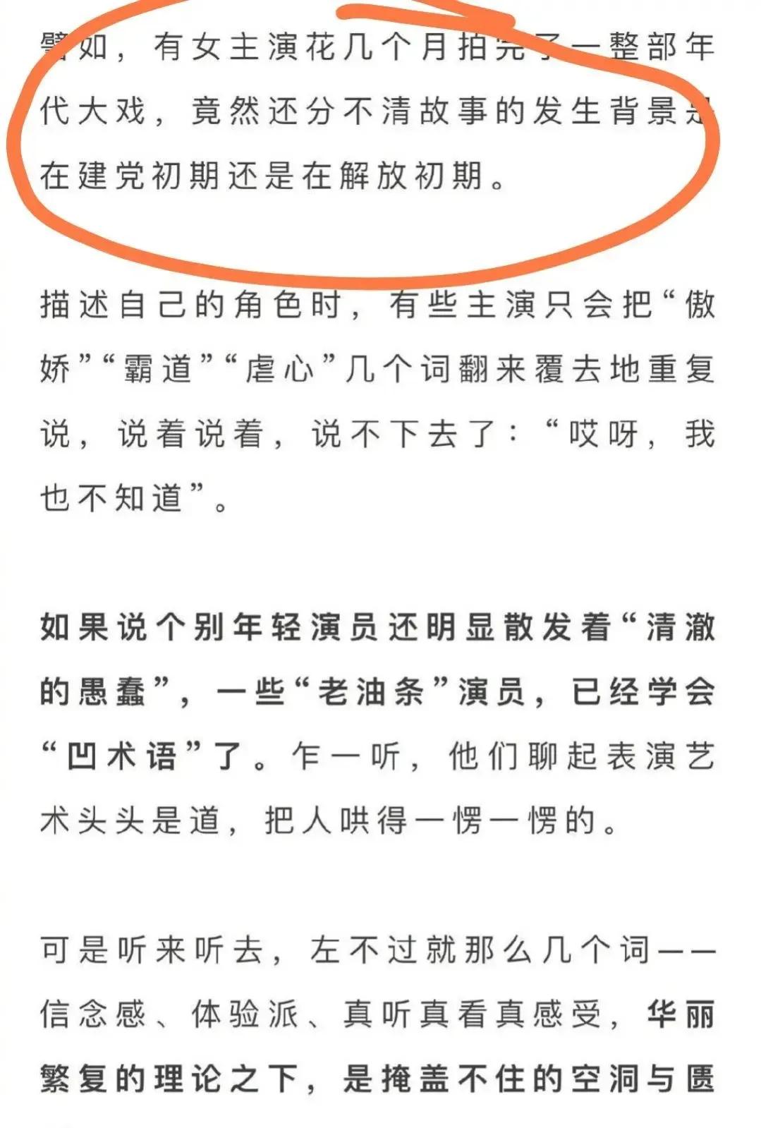 文章中,痛批了影视圈中某些演员不读书,连基本的知识都不知道……更是提及了一位女演员,在拍完一部年代大戏之后,竟然还没有搞清楚故事发生的背景是建党初期还是解放初期……
