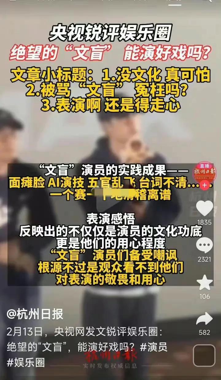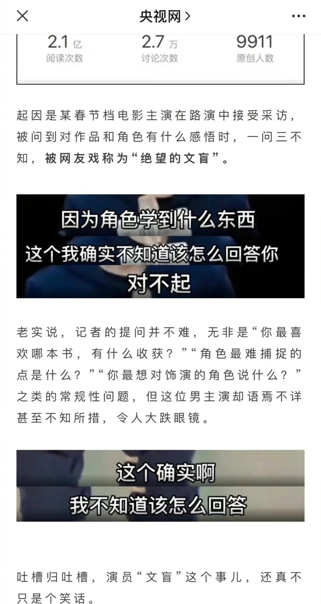 其实此事件之后,央视一篇报道中也曾引用“绝望的文盲”一词来形容现在的许多演员的现状。